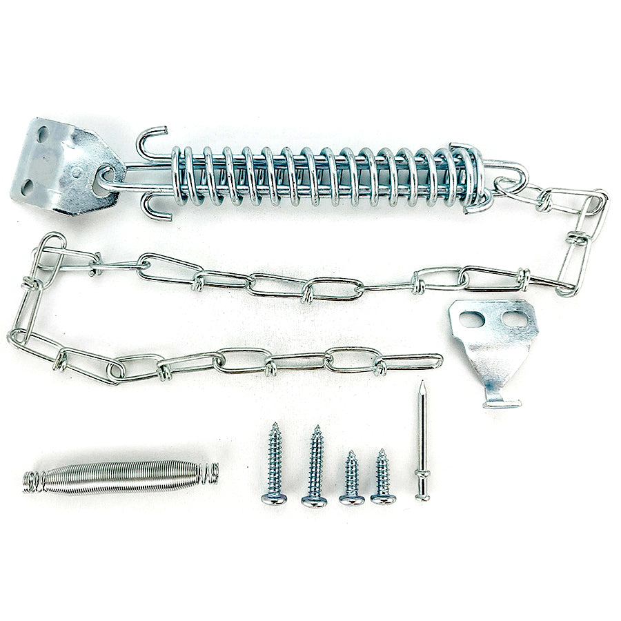 Screen door check chain, zinc plated. Includes hardware. Length including bracket, spring, chain, is 25"